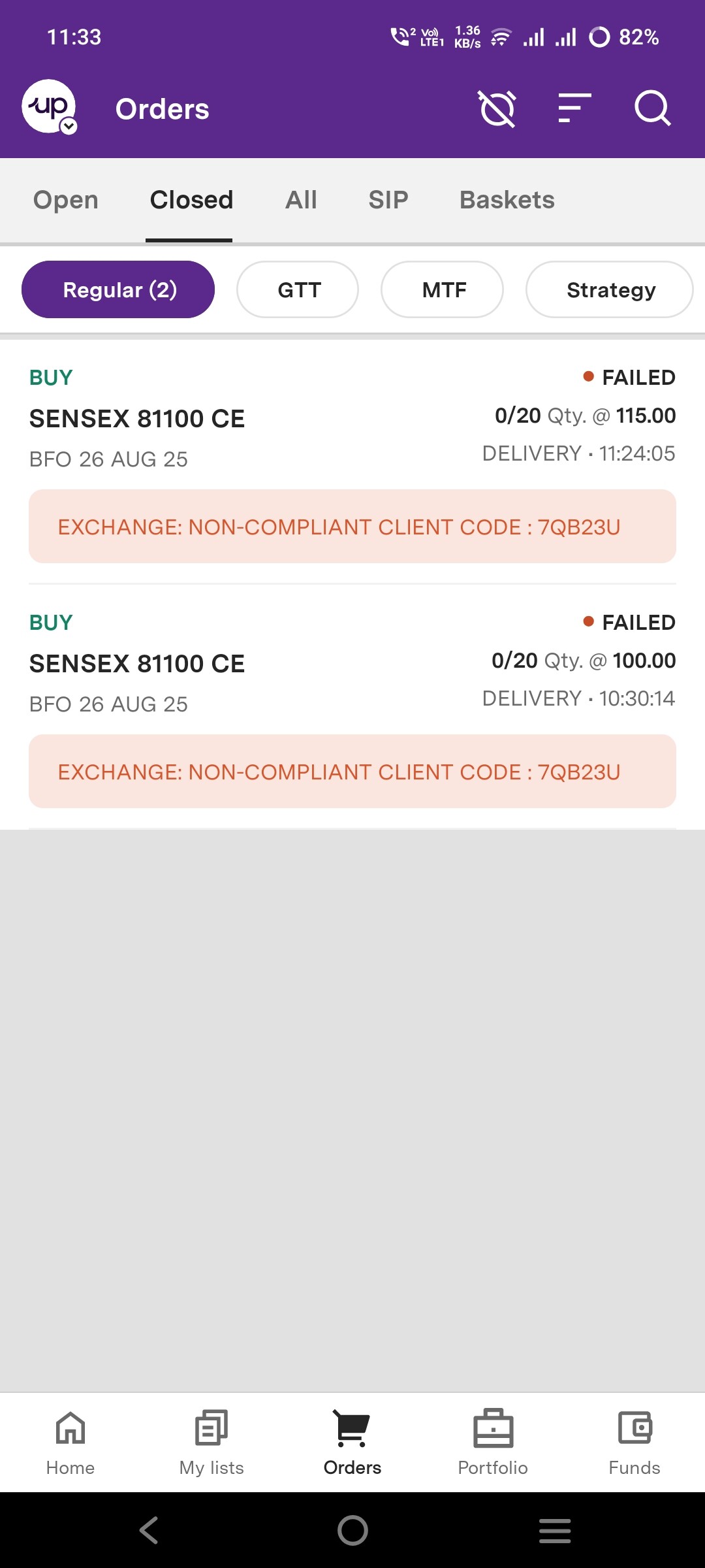 I can’t order [ Trade ]of sensex …..I got error like Exchange:- non - compliant code ….
