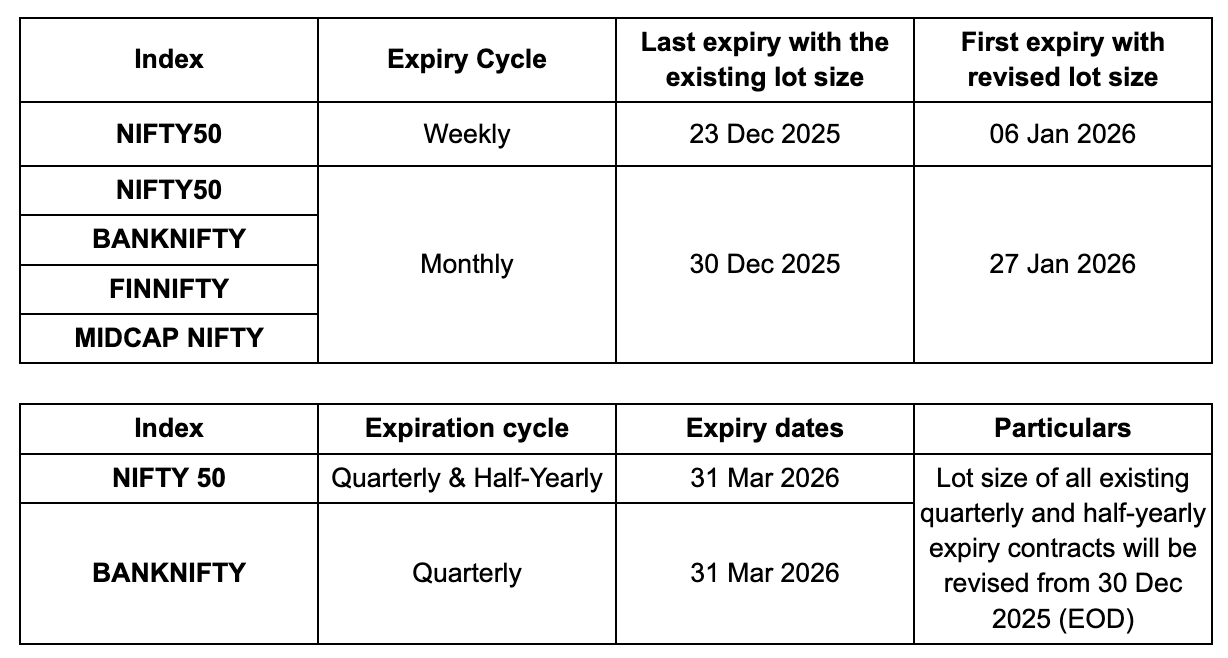 The current lot sizes will continue for all weekly and monthly contracts until 30 December 2025. From 30 December 2025 (EOD), the revised lot sizes will also apply to all quarterly and half-yearly contracts.